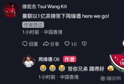 该动态评论区,港脚徐宏杰留言调侃:“曼联以1亿英镑签下周缘德,here we go!”