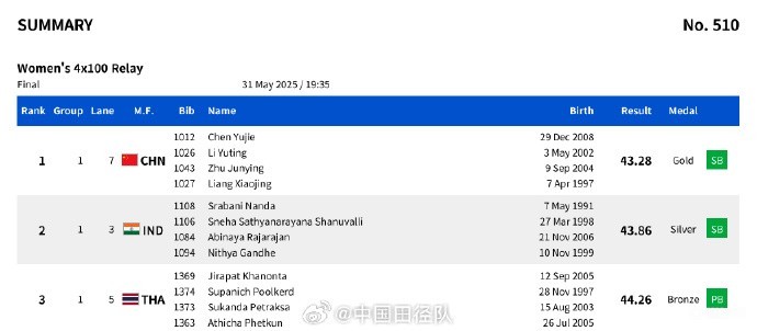 女子4×100米接力:陈妤颉、李玉婷、朱俊颖、梁小静43.28秒,摘得金牌gaoniu @懂球帝2025-05-31 21:495月31日,第26届亚洲田径锦标赛女子4×100米接力决赛,在当晚刚结束女子200米决赛比拼的陈妤颉和李玉婷,与队友朱俊颖、梁小静一起跑出43.28秒,摘得金牌。展开更多