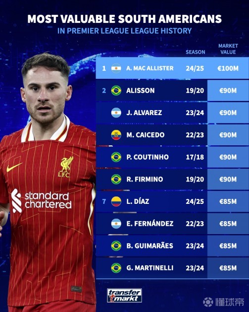 英超南美球员最高身价top10:麦卡利斯特1亿欧登顶