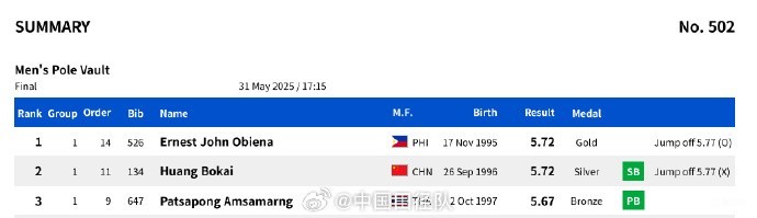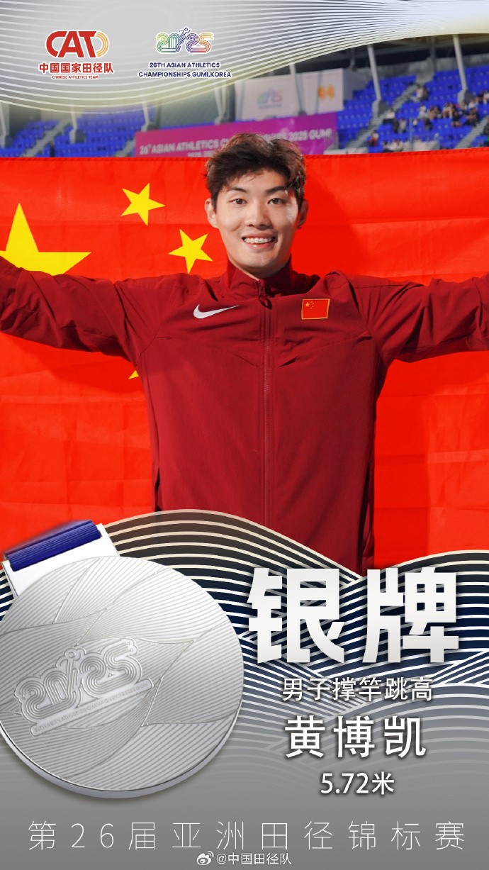 5月31日,第26届亚洲田径锦标赛男子撑竿跳高决赛,黄博凯以5.72米摘得银牌,另一位中国选手李晨洋5.52米排名第五。