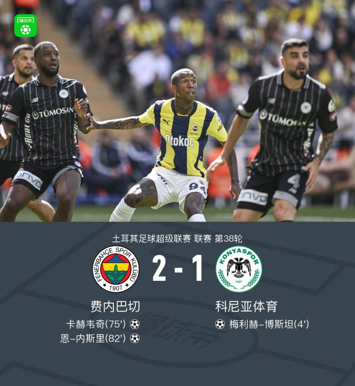 北京时间5月31日土耳其足球超级联赛 第38轮,费内巴切主场对阵科尼亚体育。科尼亚体育梅利赫-博斯坦开场破门,下半场,费内巴切卡赫韦奇将比分扳平,随后,恩-内斯里打入一球将比分逆转。全场战罢,费内巴切 2-1 战胜科尼亚体育。