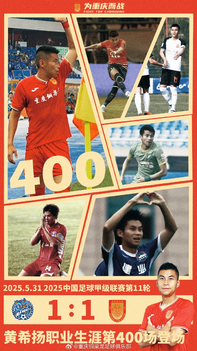 重庆铜梁龙官方晒出海报并写道:2025年5月31日,重庆铜梁龙客场对阵佛山南狮的比赛第81分钟,黄希扬替补登场,达成个人职业生涯400场成就。