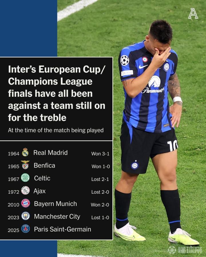 欧冠决赛,国际米兰将对阵巴黎圣日耳曼,据统计,国米队史7次欧冠决赛对手都是有望实现三冠王的球队。
