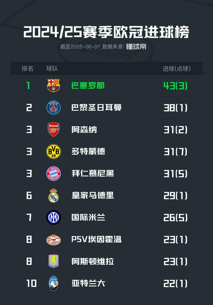 2024-25赛季欧冠落幕,在球队进球榜上,巴塞罗那以43球居首,新科欧冠冠军巴黎圣日耳曼以38球排名第二,阿森纳、多特蒙德和拜仁慕尼黑均打入31球,并列第三。