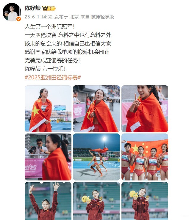 6月1日,亚洲田径锦标赛收获女子4x100米接力、女子200米两金,16岁小将陈妤颉更新社媒发文:人生第一个洲际冠军!感谢国家队给我单项的锻炼机会。