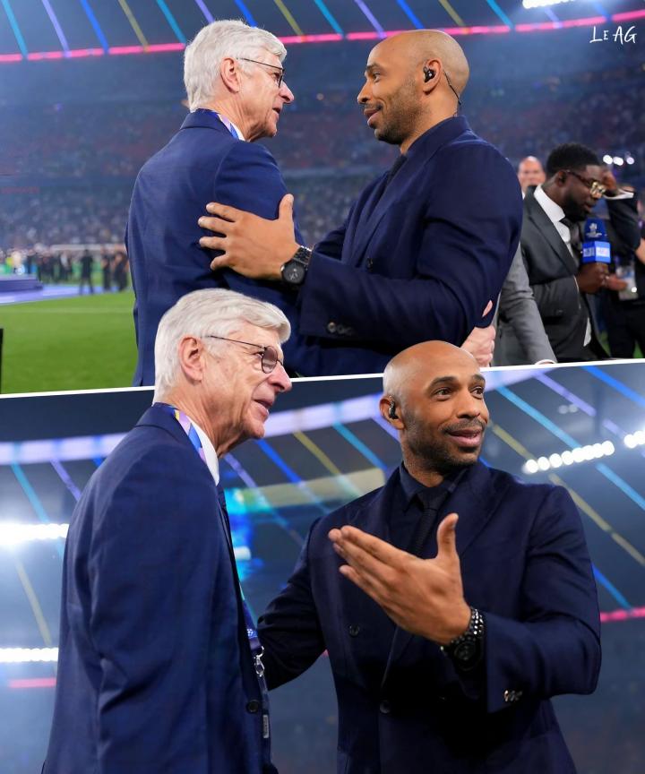 法国足球观察者巴黎圣日耳曼在欧冠决赛中5-0大胜国际米兰,赛后,亨利和温格这对阿森纳传奇师徒一同庆祝。