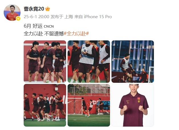 北京时间6月1日晚,中国男足国脚曹永竞在社交媒体里晒出国家队训练照和定妆照,配文写着:“6月,好运🇨🇳🇨🇳全力以赴,不留遗憾。”