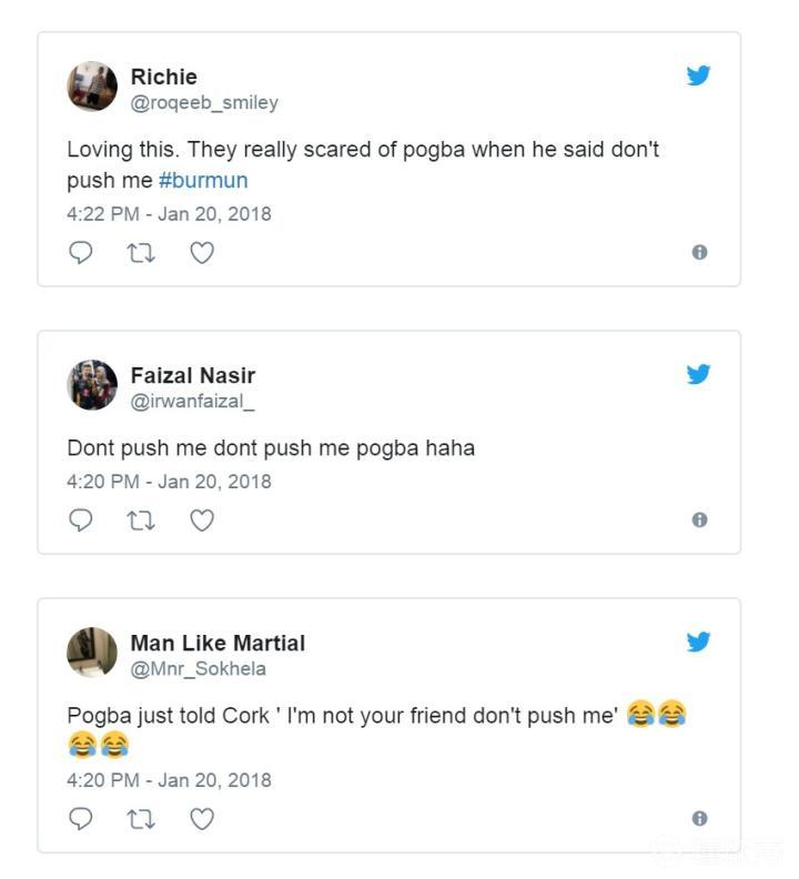 博格巴。毫无疑问还是曼联在德赫亚之外最稳定的一位。位置更靠前的法国人经常可以参与到左边杨教授和马夏尔的小团体中打打配合,虽然没了之前在埃弗顿那样的现象级表现,但只要保持健康,法国人就可以为中前场提供灵感和硬度。上半场两个火药桶,一个是马夏尔和伯恩利26号巴德斯利,另一个就是博格巴和前斯旺西中场杰克-科克。一段视频截图被摄像机抓到,对博格巴频繁“照顾”的科克,遭到法国人的回击“Don't push me, don't push me, I'm not your friend, don't push me...”