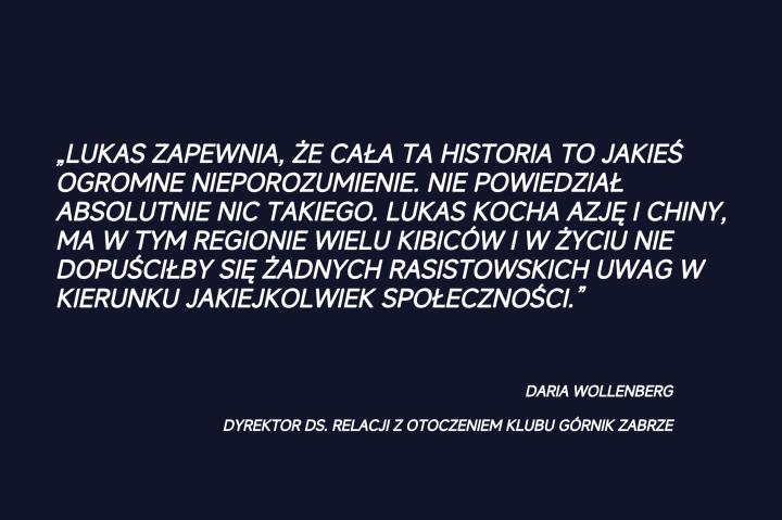 扎布热矿工官方表示:“卢卡斯(波多尔斯基)保证,整个事件完全是一个巨大的误会。他绝对没有说过那样的话。卢卡斯热爱亚洲和中国,在这个地区有很多支持他的球迷,他一生中绝不会对任何群体发表种族主义言论。”