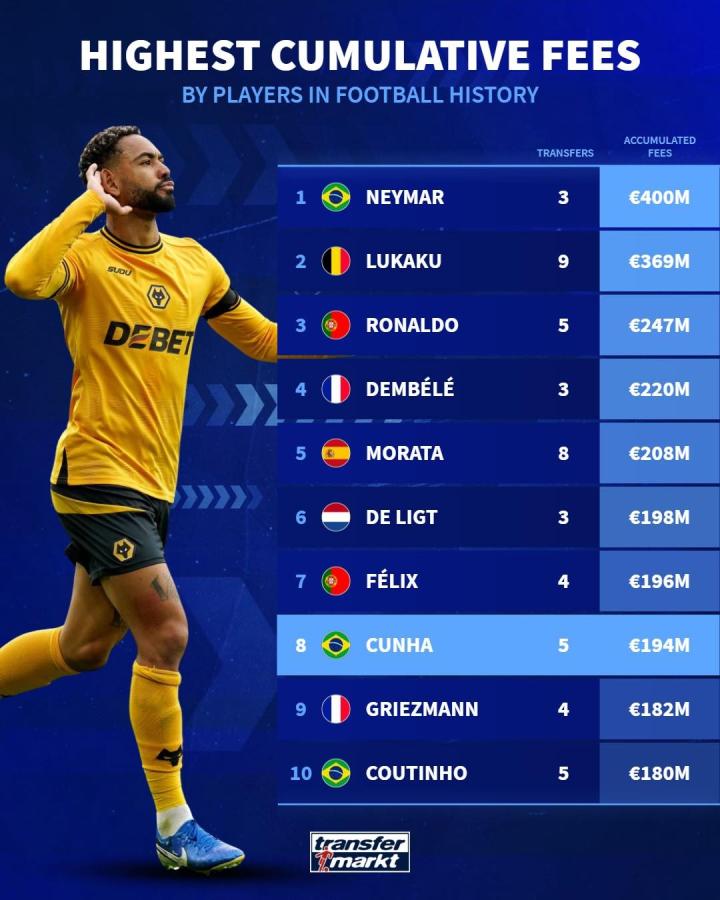 曼联官方宣布与狼队就马特乌斯-库尼亚转会达成协议,据悉转会费为7400万欧。据德国转会市场网站统计,库尼亚职业生涯累计转会费已达到1.94亿欧,为历史第八多。