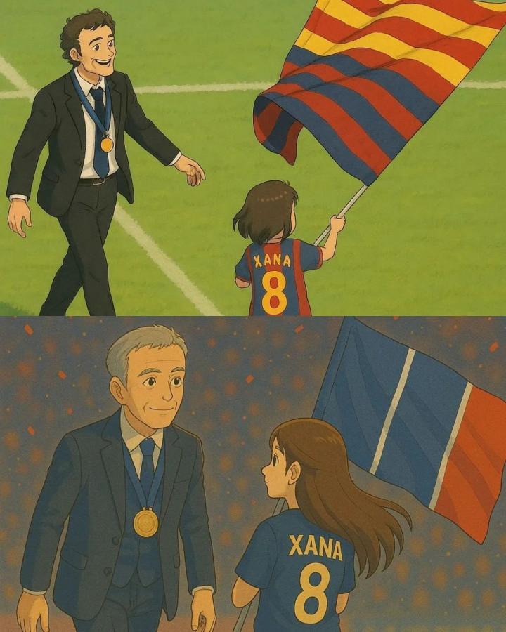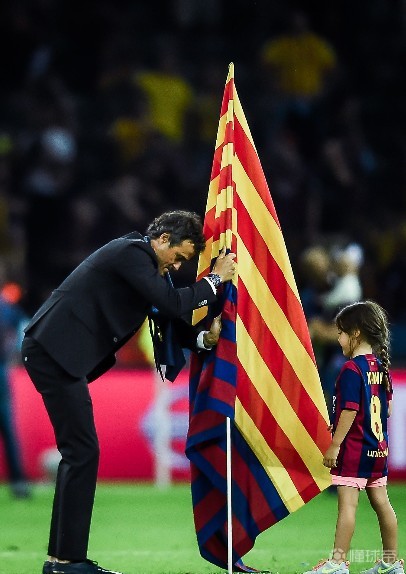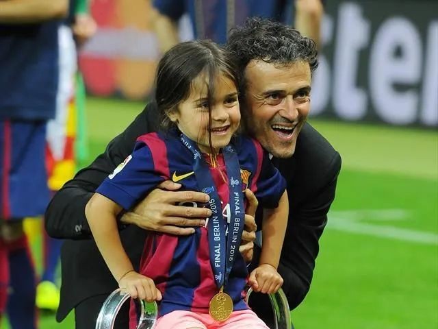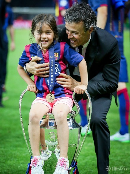 2015年6月,德国柏林的欧冠决赛,路易斯-恩里克带领巴萨3-1战胜尤文图斯,拿下那个赛季的三冠王。赛后,他五岁的小女儿莎娜挥舞着代表巴萨的旗帜,还插到了球场上庆祝胜利。