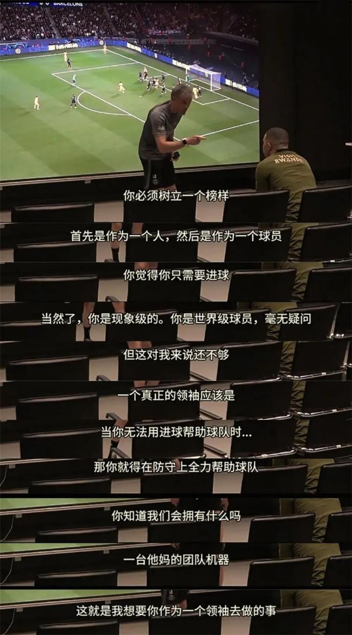 前不久公布的个人纪录片里,就有他对着刚在比赛里上演帽子戏法的姆巴佩一通说教,让对方多参与防守的神奇画面。