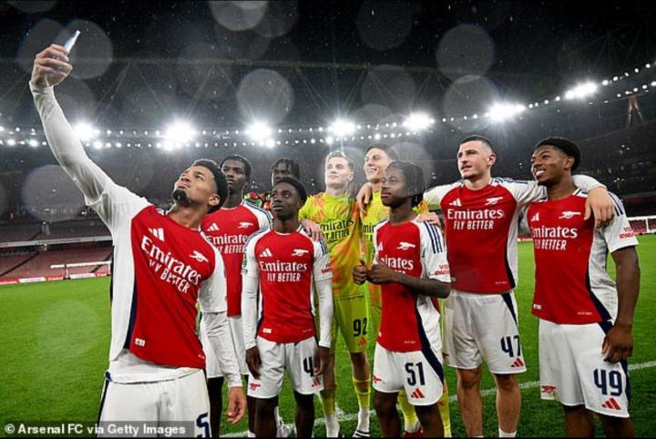 艾登-海文(左二)仅代表阿森纳一线队出场一次,与恩瓦内里(最左边)和刘易斯-斯凯利(最右边)等人一起出场