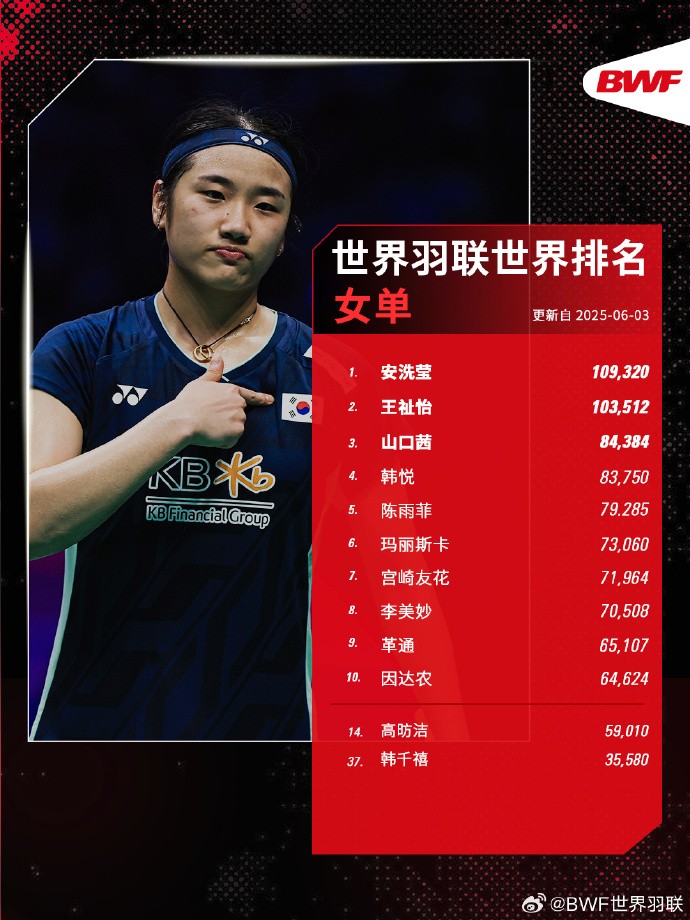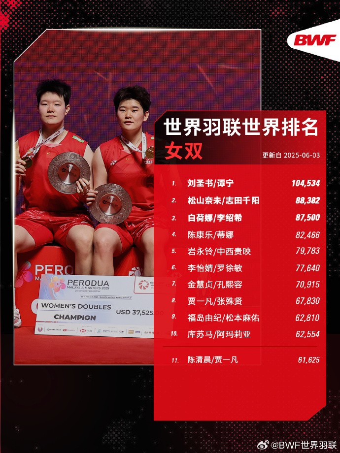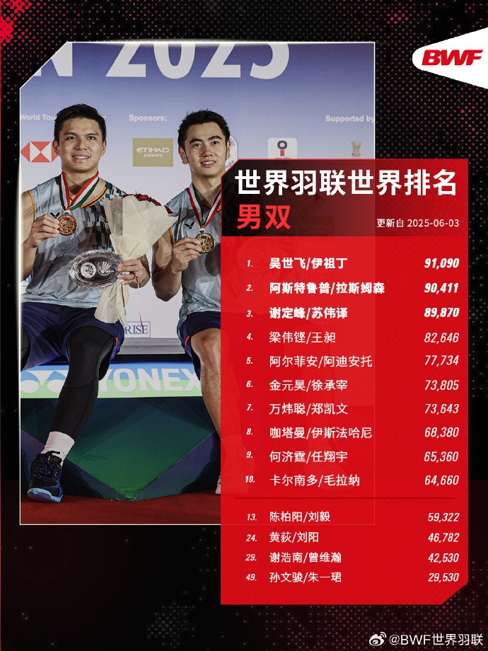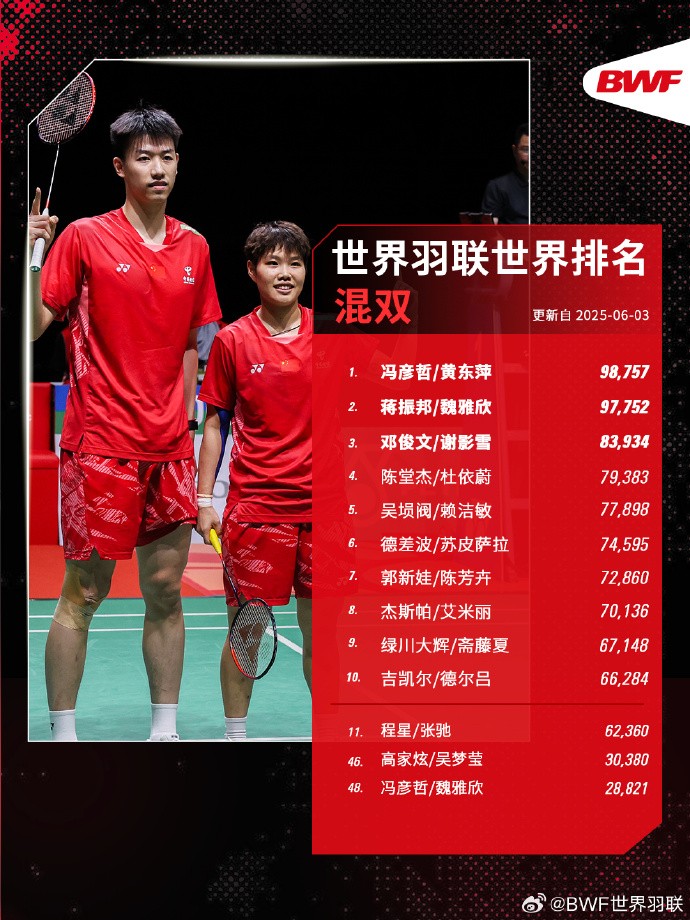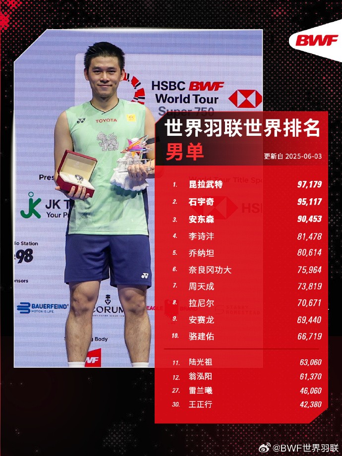 世界羽联最新排名:昆拉武特首登世一,安洗莹、圣坛、凤凰继续领跑gaoniu @懂球帝2025-06-03 18:036月3日,世界羽联公布了2025年第23周世界排名,昆拉武特首登男单世界第一。安洗莹、吴世飞/伊祖丁、刘圣书/谭宁、冯彦哲/黄东萍继续领跑各单项第一。展开更多