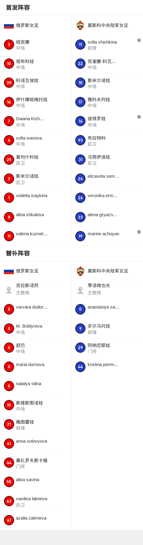 第32分钟,莫斯科中央陆军女足球员sofia shishkina打入一球。