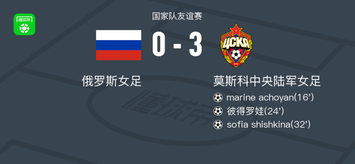 北京时间6月3日国家队友谊赛,俄罗斯女足对阵莫斯科中央陆军女足。莫斯科中央陆军女足marine achoyan破门,彼得罗娃破门,sofia shishkina破门。最终比分俄罗斯女足 0-3 莫斯科中央陆军女足。
