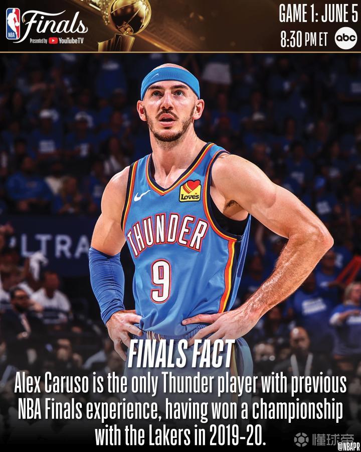 据统计,在雷霆队阵中,卡鲁索是全队唯一拥有总决赛经验的球员,他在2019-20赛季效力于湖人队时随队夺得了总冠军。