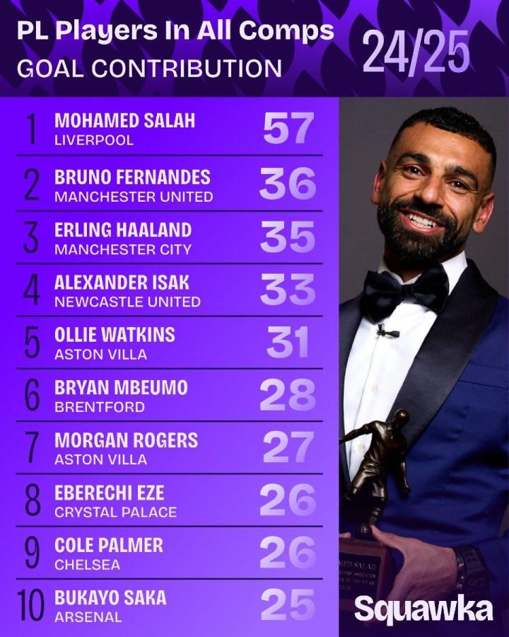 今日,数据网站Squawka公布了英超球员2024-25赛季在各项赛事直接参与进球数最多的十名球员,其中萨拉赫位居榜首,B费和哈兰德分列二三。
