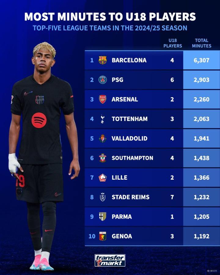 24-25赛季五大联赛U18球员出场时间:巴萨断层领先,巴黎第二