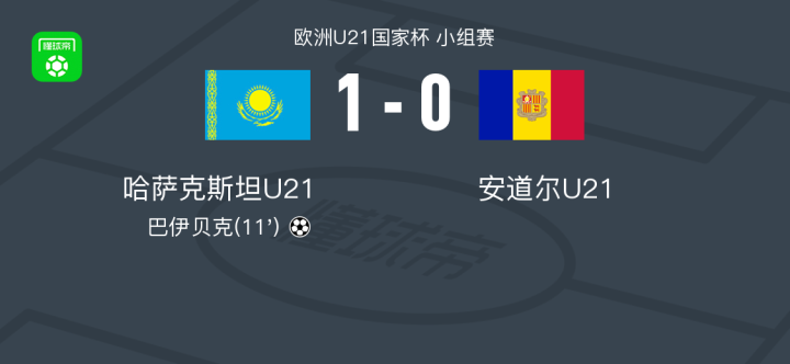 哈萨克斯坦U21 1-0安道尔U21,巴伊贝克打进全场唯一进球
