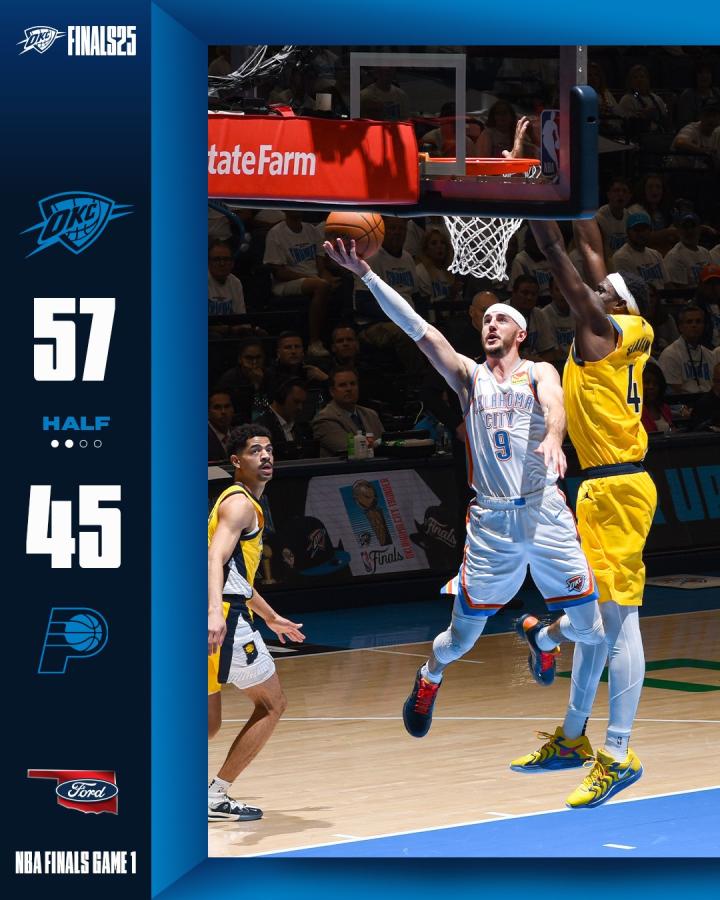 北京时间今日,本赛季NBA总决赛正式开战,在G1上半场比赛中,雷霆队在主场暂时以57-45领先于步行者队。