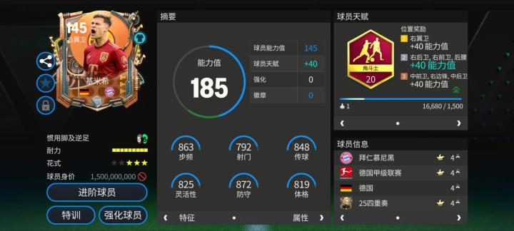 拜仁慕尼黑的6号球衣属于球队的后场万金油基米希。游戏中,基米希在赛场乐章四重奏活动推出的球员卡能力值达到145,配备了角斗士天赋。