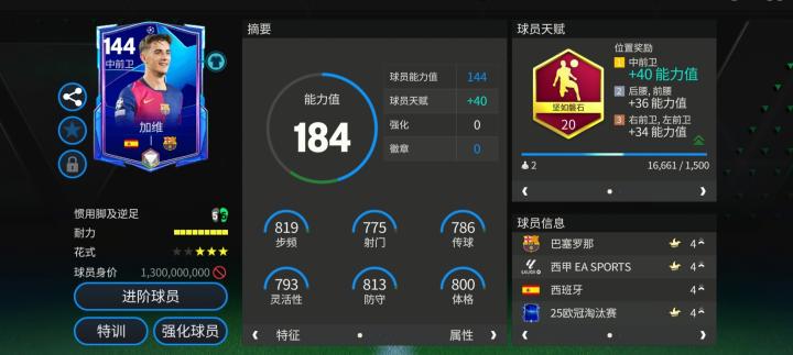 巴塞罗那的6号球衣属于中场核心之一的加维。游戏中,加维在欧冠淘汰赛活动中推出了一张144能力值的球员卡,天赋配备了坚如磐石,提升了他的防守表现。