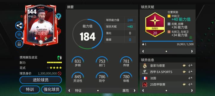 另一支西甲豪门皇家马德里的6号球衣属于法国人卡马文加。西甲联赛活动中,卡马文加同样推出了一张144能力值的球员卡,配备了中场热门的指南针天赋。