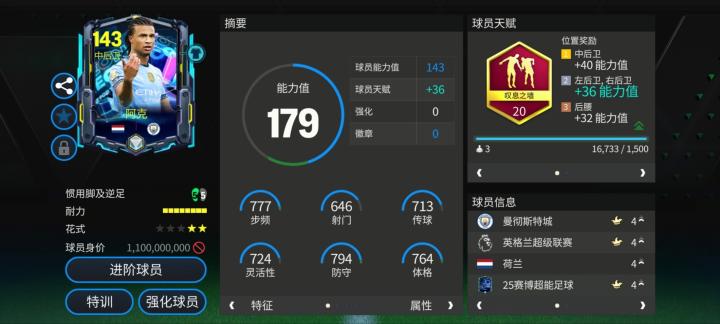 曼城的6号球衣属于后场核心之一的荷兰人阿克。游戏中,阿克在赛博超能足球活动中推出了一张143能力值球员卡,天赋配备了叹息之墙,着重增强了防守表现。