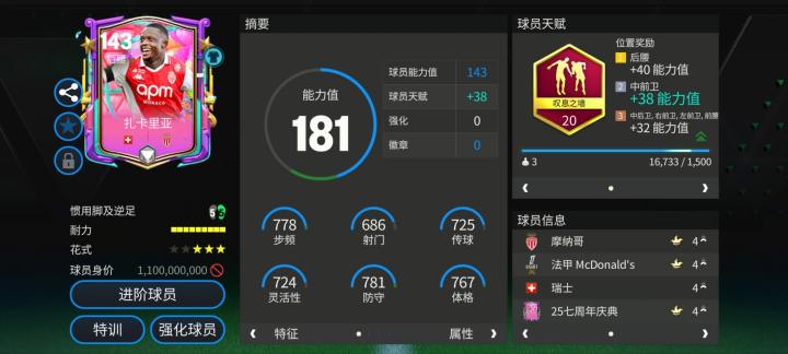 实战中,扎卡里亚身材高大强壮,同时也有不俗的持球进攻能力。防守端,扎卡里亚不仅预判拦截精准,对手持球进攻时,他的冲抢破坏能力以及近身干扰强度也都非常不错。进攻端,扎卡里亚后插上的爆射犀利,打门起脚迅速的同时还有稳定的抗干扰效果,盘带方面,扎卡里亚的花式衔接紧凑,对手近身防守时也能保持球权控制。