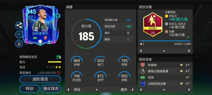 英超豪门阿森纳的6号球衣属于加布里埃尔,他的缺阵是球队欧冠没能更进一步的一个重要因素。游戏中,145能力值的欧冠淘汰赛加布里埃尔配备了坚如磐石天赋。