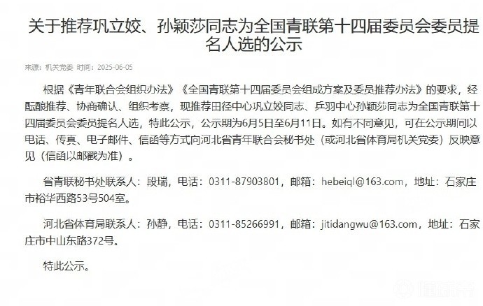官网原文写到:根据《青年联合会组织办法》《全国青联第十四届委员会组成方案及委员推荐办法》的要求,经酝酿推荐、协商确认、组织考察,现推荐田径中心巩立姣同志、乒羽中心孙颖莎同志为全国青联第十四届委员会委员提名人选,特此公示,公示期为6月5日至6月11日。