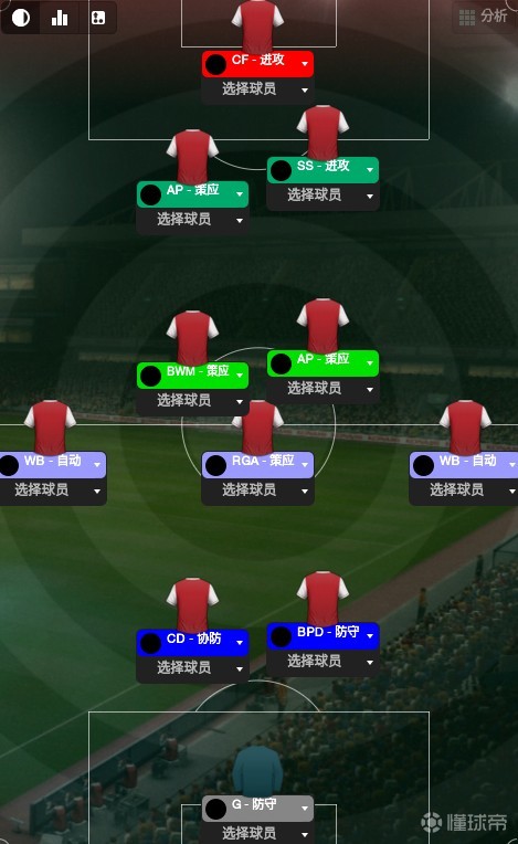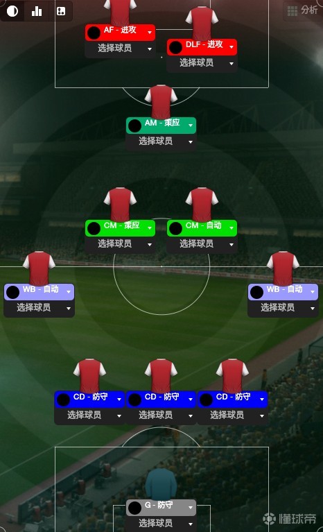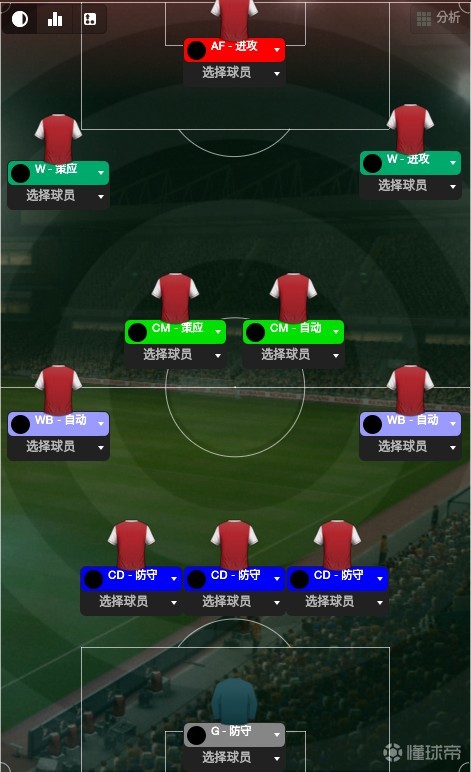 最后,前锋,并不需要一个站桩中锋,因为我们不起高球,冲击力强一点,有一定做球能力的全能前锋即可,没有的话,抢点型前锋也可以,不要用拖后前锋,也不要设置回撤,那样的话禁区前会显得很拥挤。