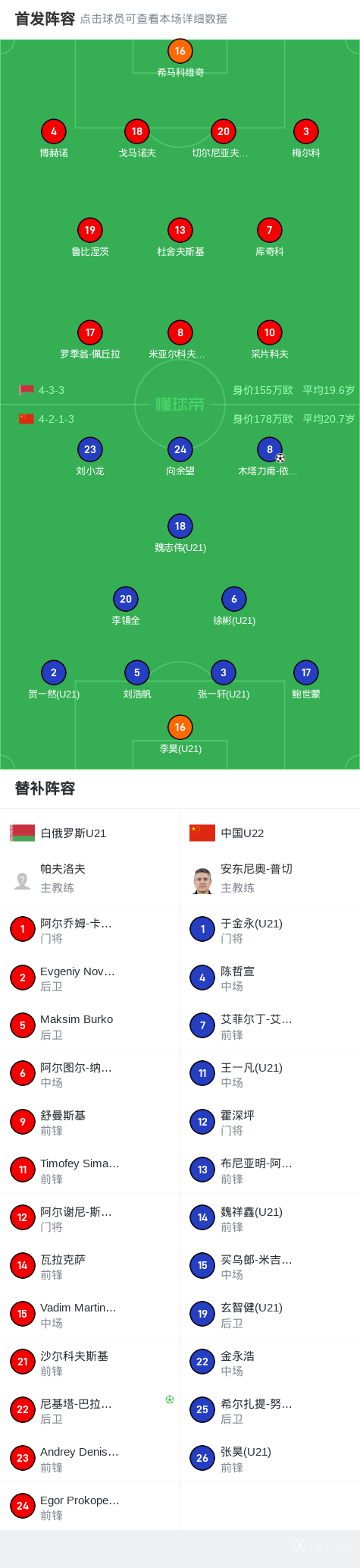 中国U22 1-1战平白俄罗斯U21,木塔力甫破门+中柱