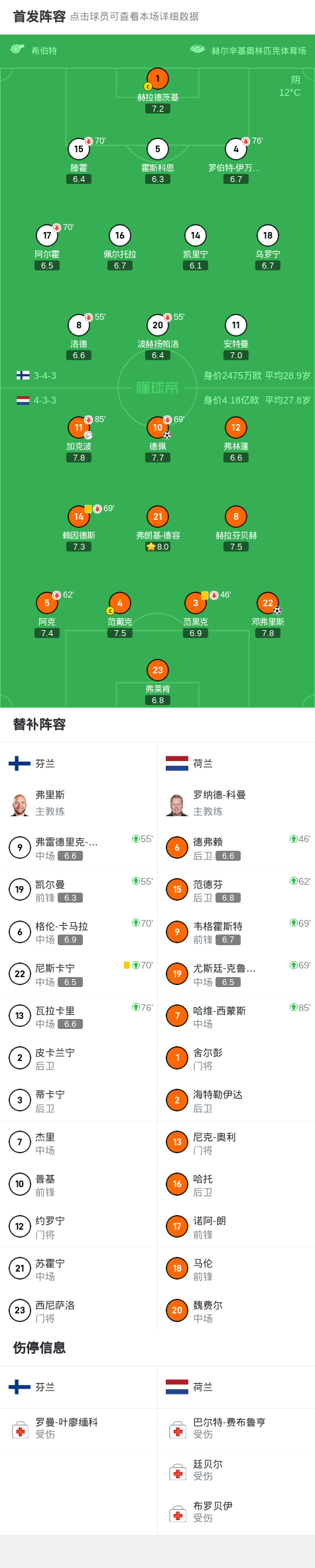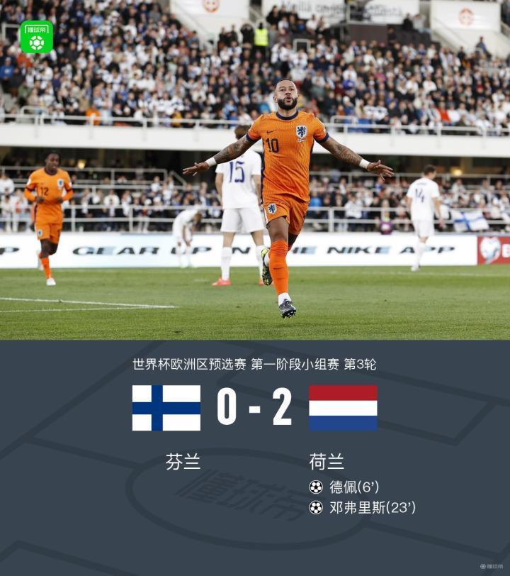 世界杯欧洲区预选赛第一阶段小组赛第三轮,芬兰与荷兰展开较量。上半场,芬兰后卫乌龙助攻,德佩破门。随后,加克波助攻,邓弗里斯建功。下半场,两队均无建树。全场比赛结束,荷兰客场2-0战胜芬兰。