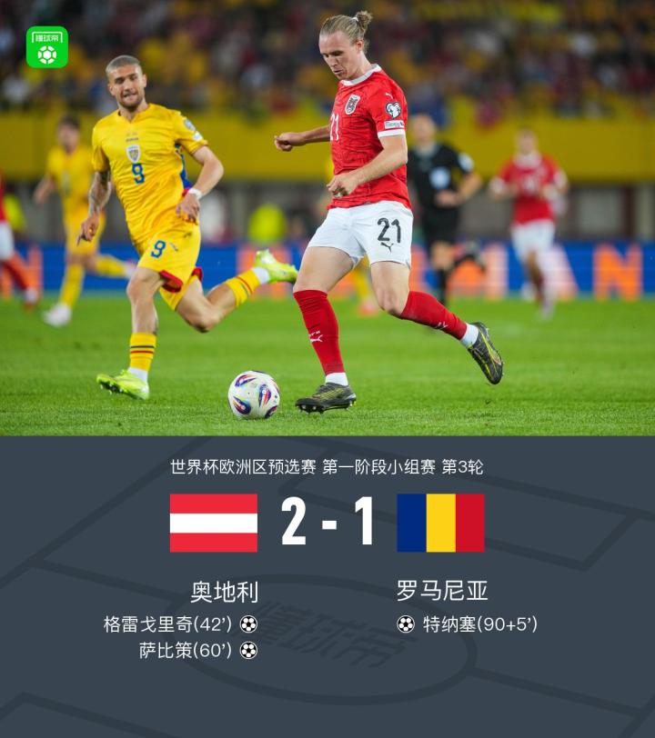 世界杯欧洲区预选赛第一阶段小组赛第3轮,奥地利与罗马尼亚展开较量。比赛中,奥地利由格雷戈里奇率先建功,随后萨比策再下一城扩大优势。罗马尼亚在比赛尾声由特纳塞扳回一球,但未能改变战局。最终,奥地利以2-1战胜罗马尼亚。
