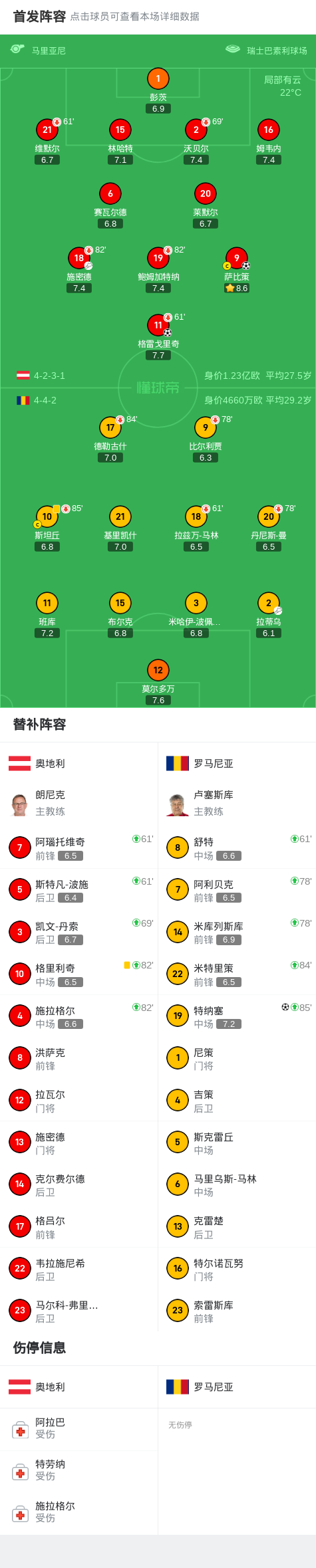 奥地利2-1罗马尼亚,格雷戈里奇破门,萨比策制胜