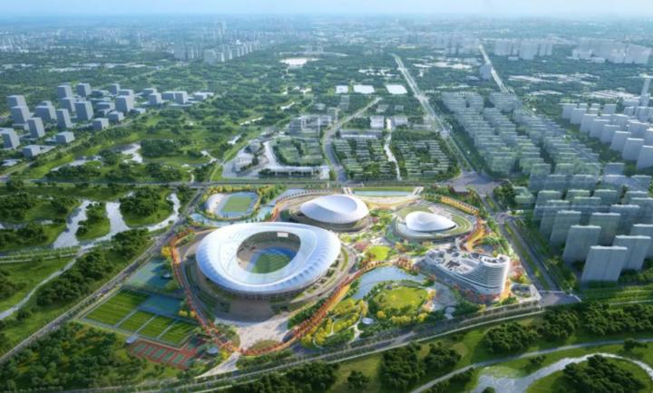 目前,目前二期体育场和体育馆的主体钢结构已合拢,接下来将进行体育场索网结构提升阶段,预计6月底将与体育场周圈桁架结构完成精准衔接与固定,今年12月底完成体育场屋盖膜结构及幕墙的整体呈现。