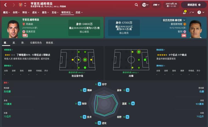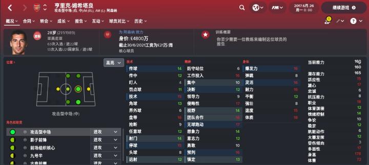 姆希塔良在FM2018中的CA为160,PA为165,这个数据可能不如桑切斯亮眼,但在前腰这个位置姆希塔良的数值也算是世界级前腰了。从位置的角度来看,姆希塔良比较擅长活跃在前锋身后的前腰位置,擅长攻击型中场的战术角色。而在边路,姆希塔良也可以胜任右内锋担任组织核心的角色。相比于已经能够打很多位置的桑切斯,姆希塔良能够胜任的位置更多,还包括了中前卫及其后腰,可见姆希塔良的万金油属性比桑切斯更强。