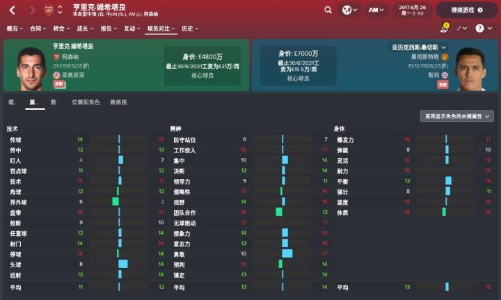 精神属性PK:精神属性中桑切斯同样全面领先,14项数据占优10项打平1项,不过同样两个人的差距并非特别大,姆希塔良在各个单项上也只是稍逊一筹,桑切斯球风更硬更勇敢(17:10),而姆希塔良更加团队(16:12),两个人的无球跑动都非常出色。