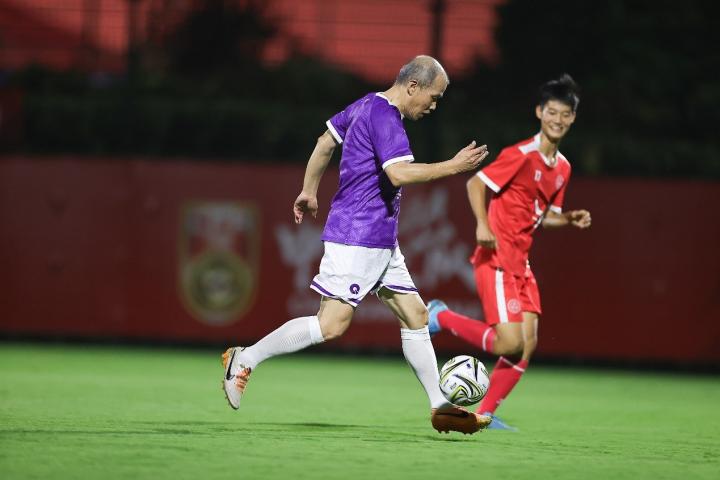 中国足协“足记之家”媒体联队和重庆市凤鸣山中学的小球员们的比赛气氛热烈、场面欢乐,双方进球络绎不绝,场边的小球员家长掌声、笑声不断。最终,双方以4比4握手言和。