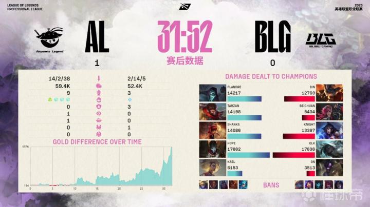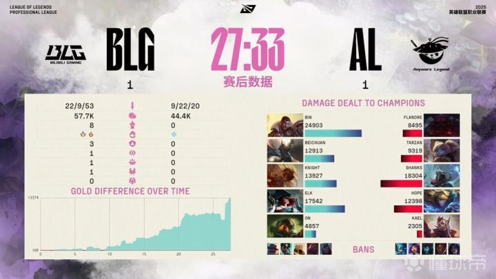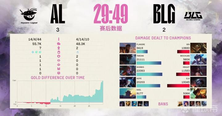 SOLO赛中,Shanks的刀妹单杀Bin后推塔帮助AL获得最后一场比赛的选边权。在今天蓝色方全胜的情况下,这为AL确立了极大的领先优势。进入游戏内,AL从对线到团战运营发挥非常优异,第11分钟的小龙团中,Hope的金克斯在被针对的情况下得以存活,打出了大量输出,AL打出1换4确立局内优势。随后AL逐渐滚动雪球,BLG无力抵挡输掉比赛。第五局的MVP给到辅助Kael的布隆。