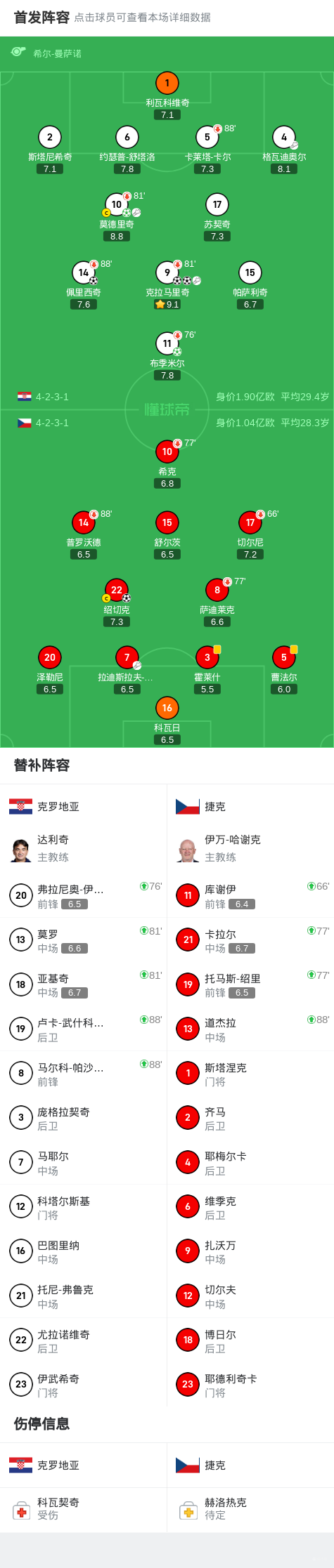 第41分钟,格瓦迪奥尔助攻克拉马里奇头球接力破门,克罗地亚1-0捷克
