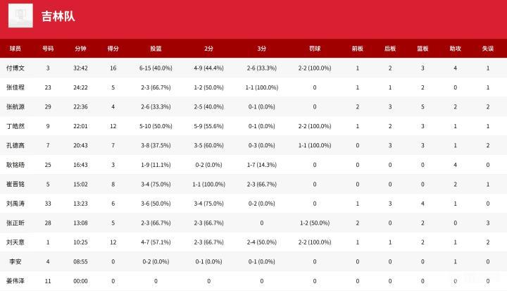 吉林男篮:付博文16分3板4助,丁皓然12分3板1助;
