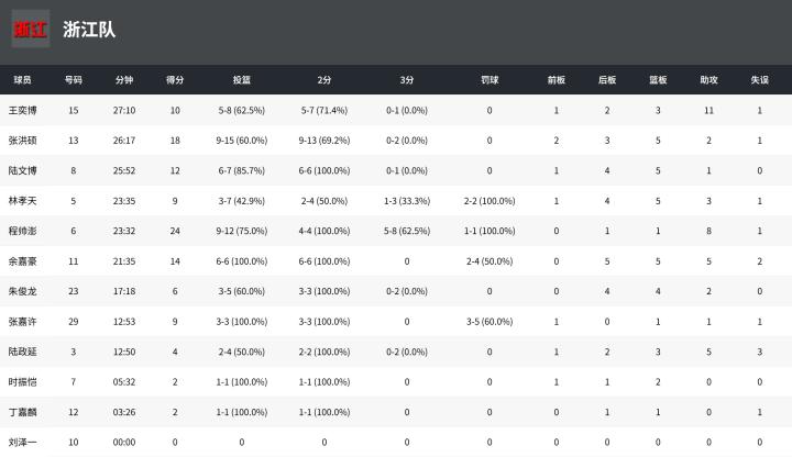 浙江男篮:程帅澎24分1板8助,王奕博10分3板11助,陆文博12分5板1助。