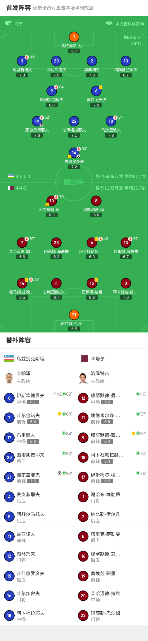 乌兹别克斯坦3-0卡塔尔,图尔贡博耶夫破门,肖穆罗多夫建功