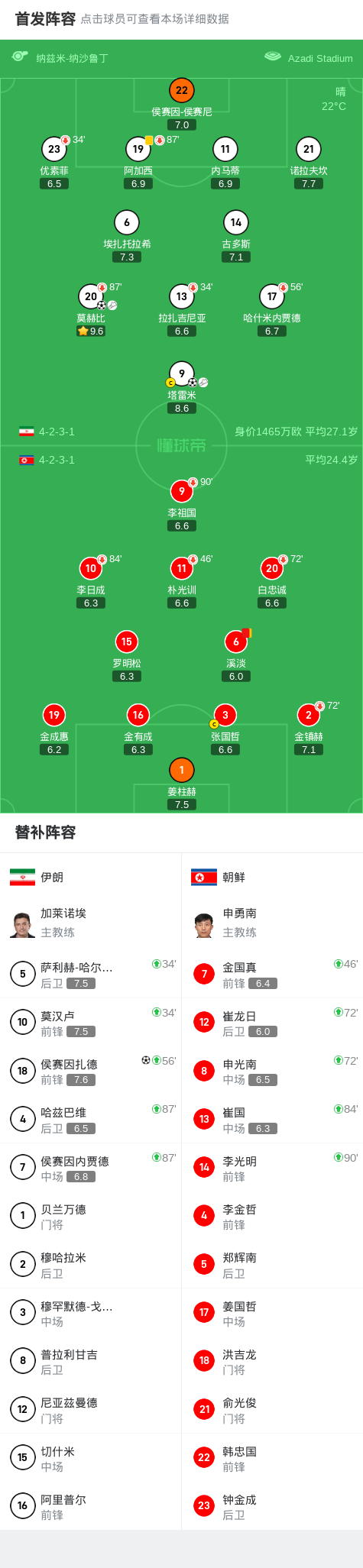 伊朗3-0大胜朝鲜,侯赛因扎德破门,塔雷米传射