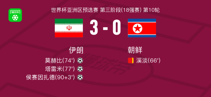 世界杯亚洲区预选赛第三阶段(18强赛)第十轮,伊朗与朝鲜展开较量。比赛中,朝鲜有一名队员因累计两张黄牌被罚离场。伊朗方面,莫赫比率先取得进球,随后他又助攻塔雷米扩大比分。比赛尾声阶段,塔雷米助攻侯赛因扎德再下一城。最终,伊朗以3-0战胜朝鲜。