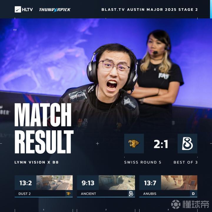 北京时间6月11日,CS2赛事奥斯汀Major-Stage2瑞士轮,中国战队LVG 2-1艰难击败B8,战绩来到3胜2负,晋级下一轮Stage3,也就是传统意义上的Major传奇组(16强)!