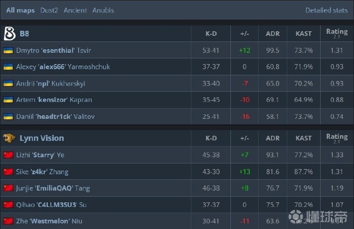 在与B8一役中,LVG率先发力,在自己最擅长的Dust2上打出水银泻地的进攻,13-2先下一城,但B8在图二遗迹中找回状态,回敬13-9,将大比分扳成1-1。两支战队均赢下自己的选图。最终在决胜图Anubis中,LVG打出漂亮的防守,上半场8-4领先,13-7获胜,大比分2-1击败对手!